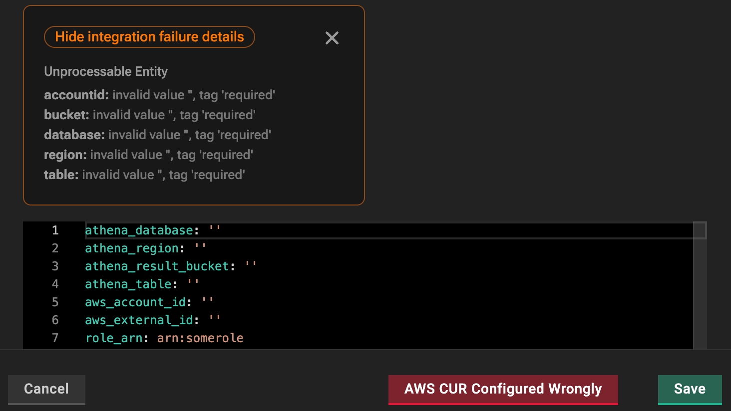 🔴 In case of AWS CUR Configured Wrongly response, check the Show integration failure details