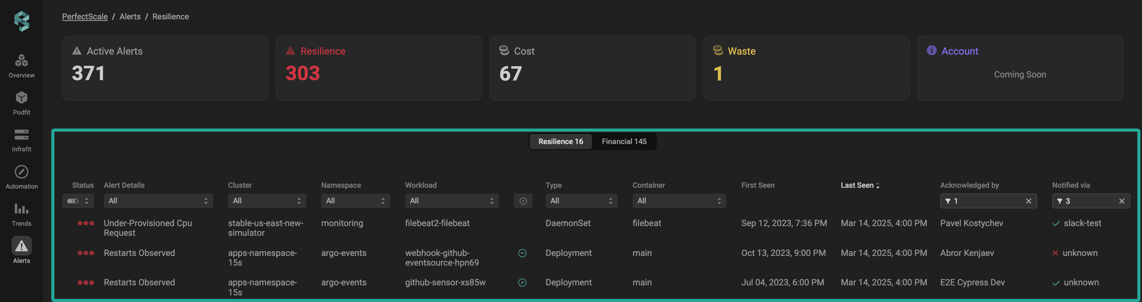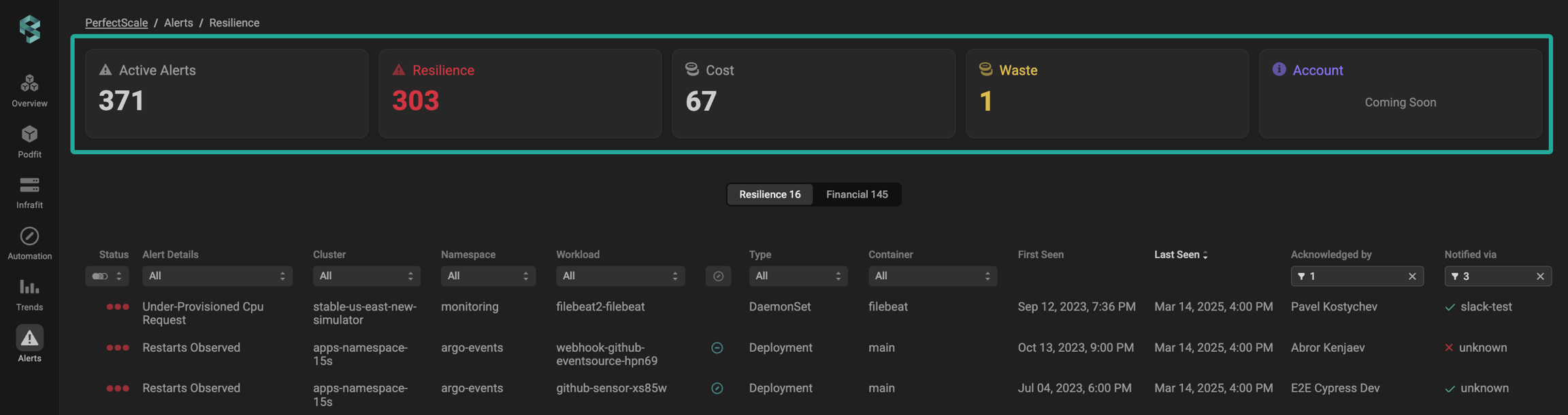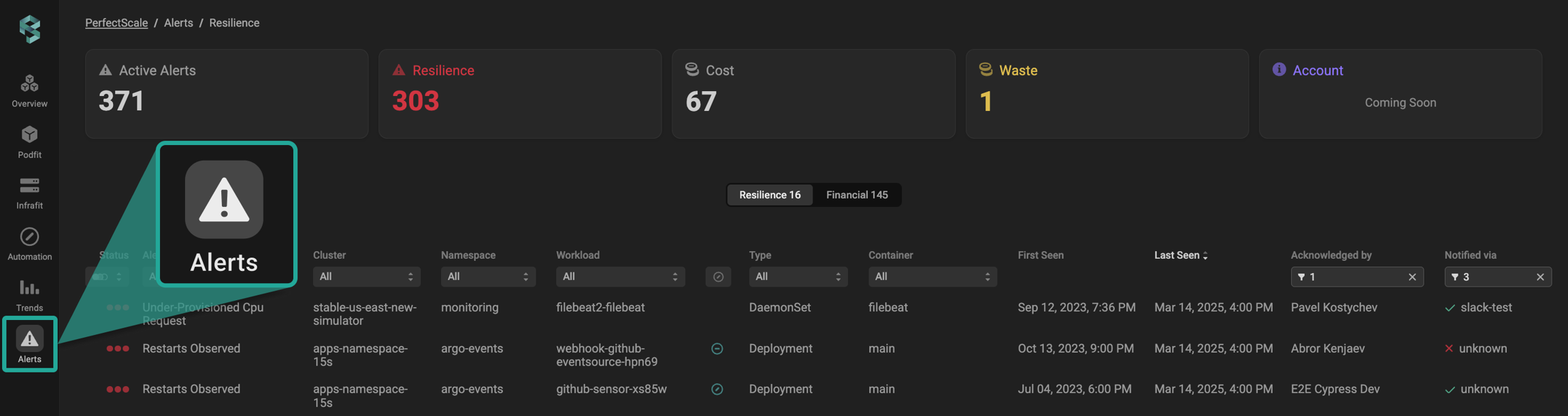 PerfectScale provides a flexible, impact-driven issue prioritization, allowing you to configure alerting tailored to your needs. Resilience Alerts are designed to notify users of potential risks that could impact workload stability and availability, inform them about issues such as resource constraints, misconfigurations, scaling limitations, etc., and help teams proactively address risks and maintain optimal cluster performance.