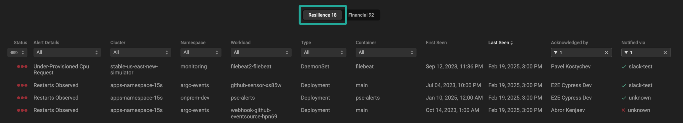 Indicates whether a team member has taken ownership of a particular alert and displays the user's name. Filter and display acknowledged alerts, acknowledged alerts by specific users, or unacknowledged alerts. Multiselect is available. Learn more about Alerts Acknowledgement here.