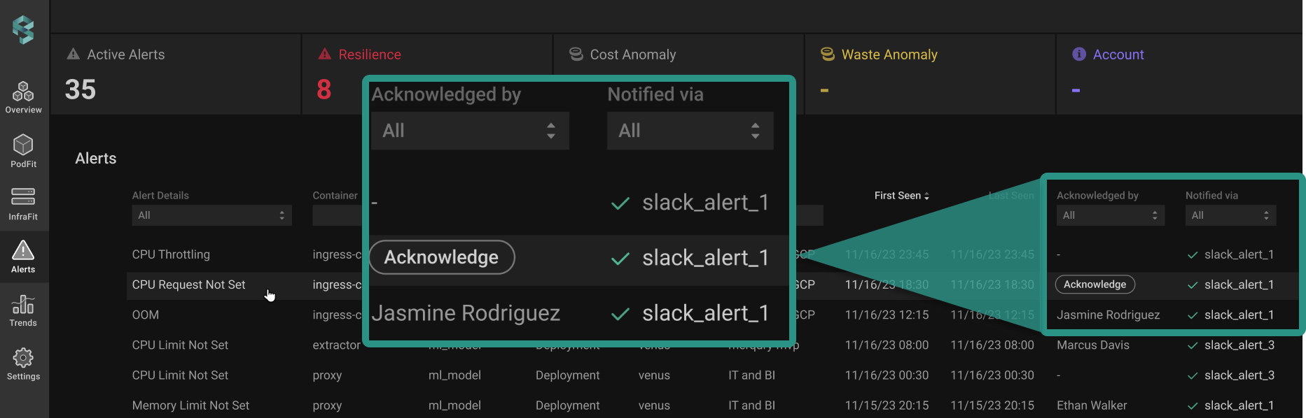 Once someone takes ownership of the alert, their name will be displayed in the `Acknowledge by` column. If the integration with [Slack](https://docs.perfectscale.io/2.0-self-hosted-or-perfectscale-documentation/customize-workflow/communication-and-messaging/slack-integration) or [MS Teams](https://docs.perfectscale.io/2.0-self-hosted-or-perfectscale-documentation/customize-workflow/communication-and-messaging/ms-teams-integration) is configured, other system users will be notified about it via the selected communication channel