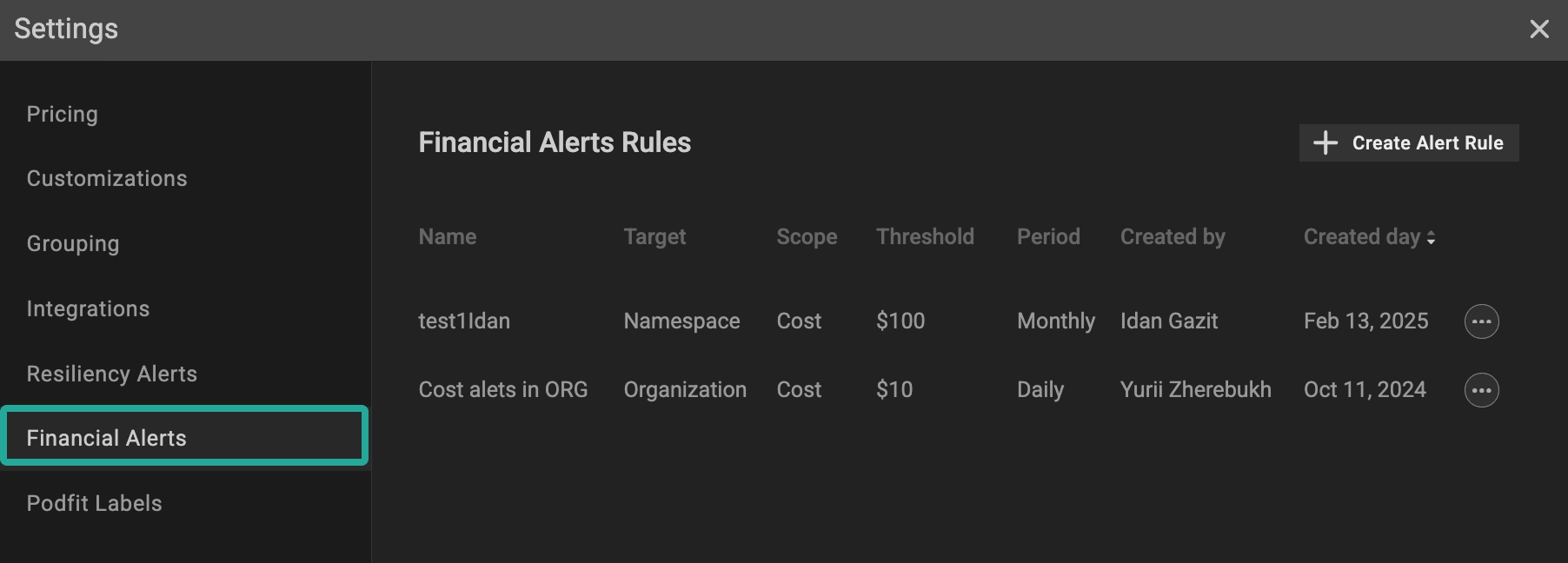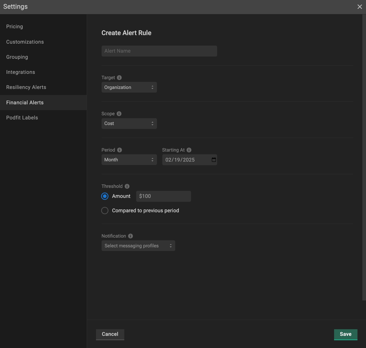 Financial alerts rule for cluster Namespace - monitors metrics of the specific namespace(s). Select the specific cluster and then the namespace(s) from the selector that appears. Use the