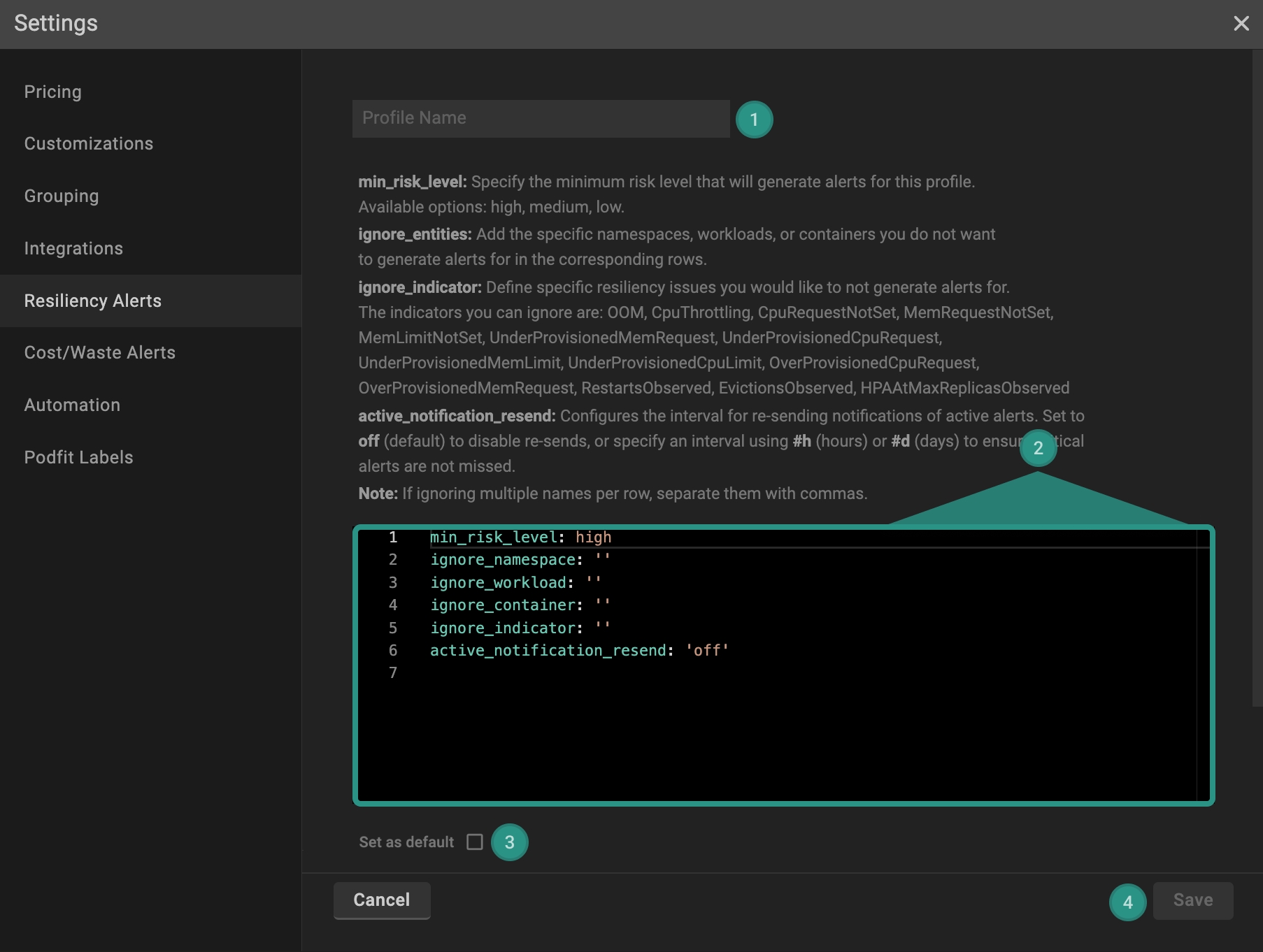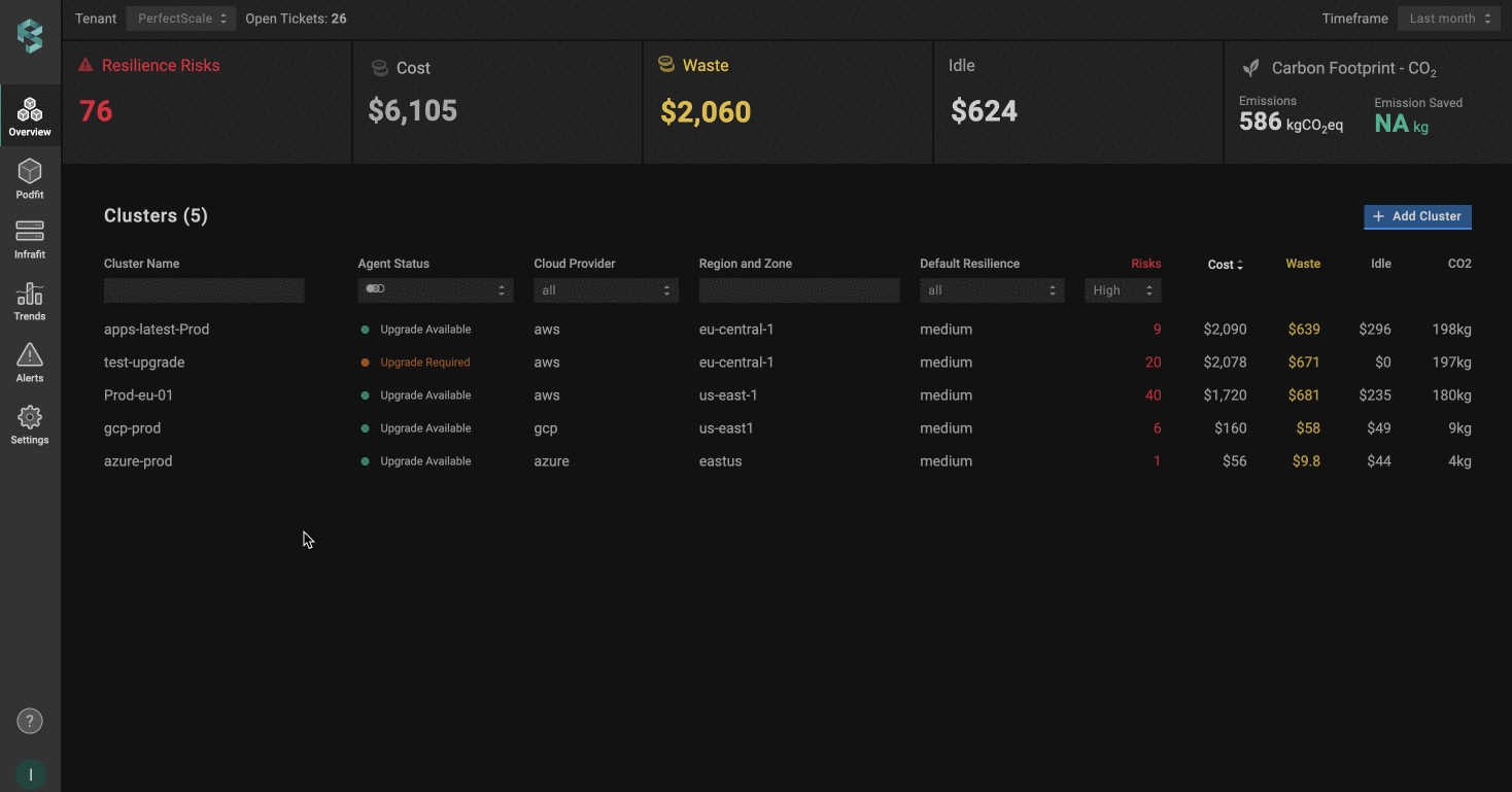 By default, PerfectScale generates alerts for every cluster where a resilience indicator with a min_risk_level: high was identified.