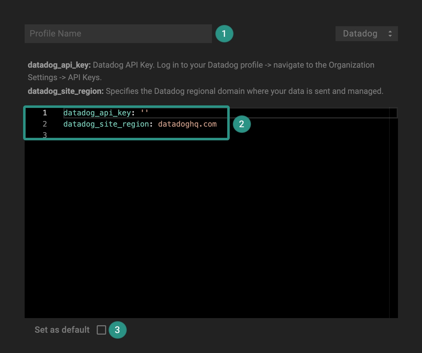 - specifies the Datadog regional domain where your data is sent and managed (example: datadoghq.com).
