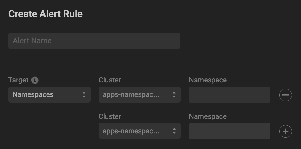 Financial alerts rule for cluster Namespace - monitors metrics of the specific namespace(s). Select the specific cluster and then the namespace(s) from the selector that appears. Use the