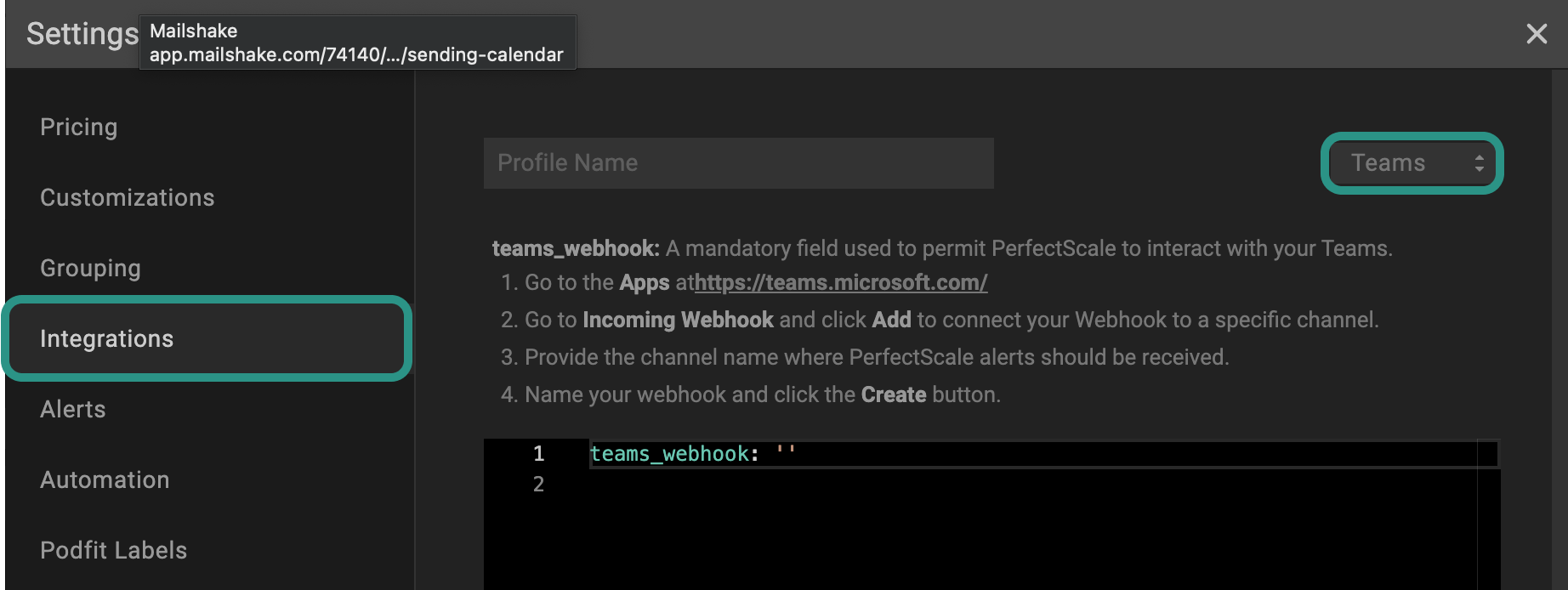 Configuring Teams integration with the profile