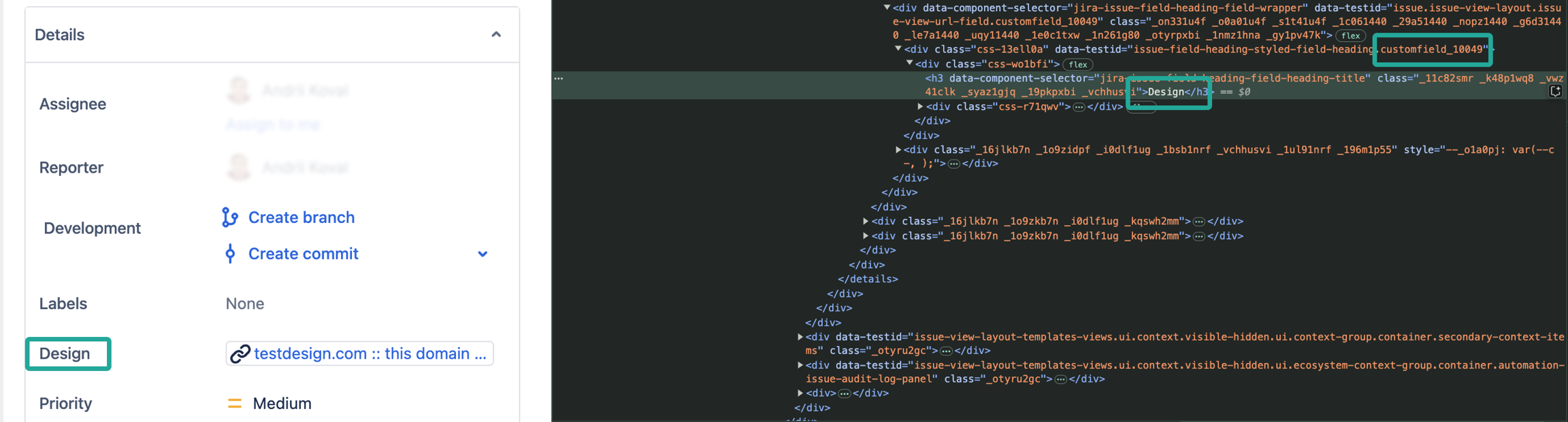 Inspect.On the Developer Tools panel, you will find the name and ID for your custom field.