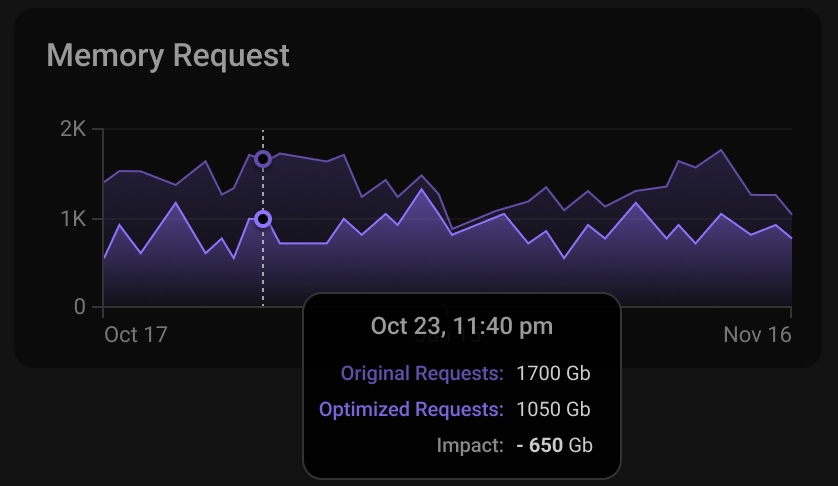 Impact quantifies the difference between the Memory requests from the original configuration and those allocated by Automation, providing clear visibility into how effectively Automation optimizes Memory allocation for your clusters.