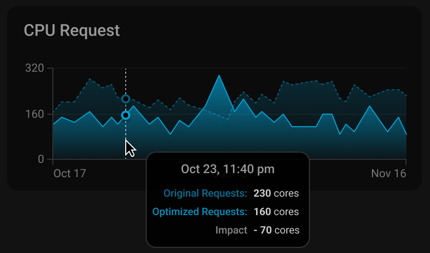 The optimized requests represent the sum of CPU requests allocated by Automation for all workloads and their replicas at the selected time.