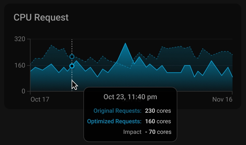 Impact quantifies the difference between the CPU requests from the original configuration and those allocated by Automation, providing clear visibility into how effectively Automation optimizes CPU allocation for your clusters.