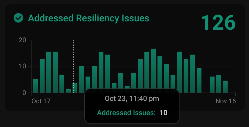 This widget highlights the resiliency risks that PerfectScale's automation has addressed within the selected time frame. In the top right corner, you can see the total count of risks addressed during this period.