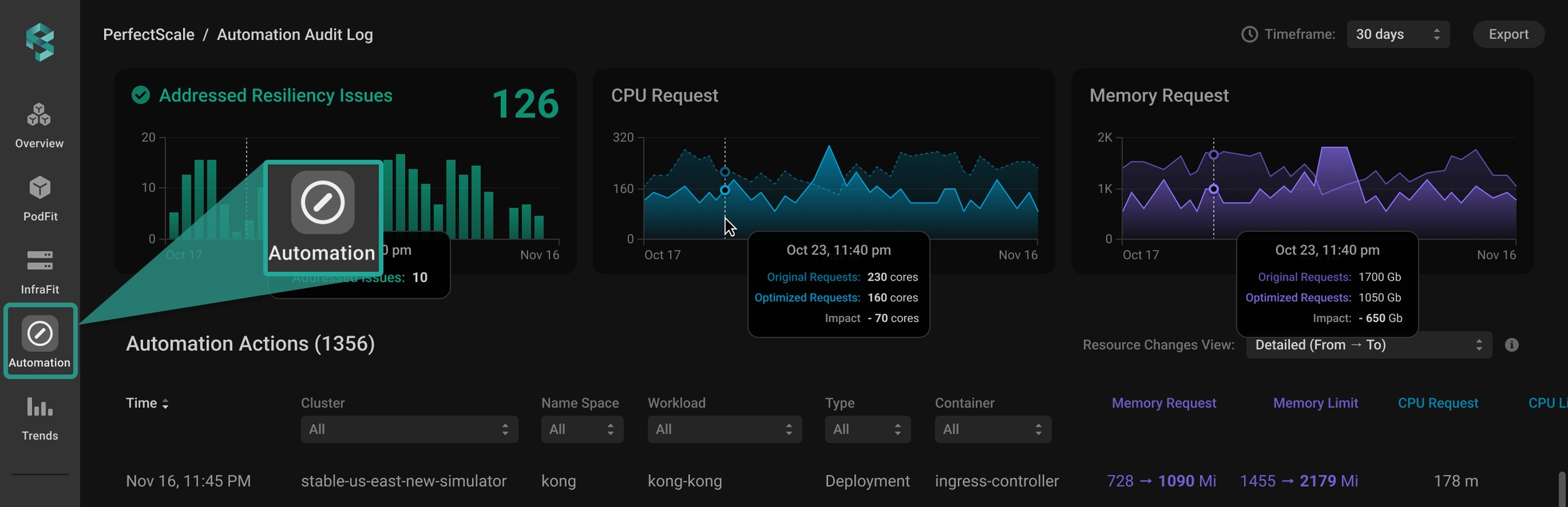 PerfectScale provides a detailed and transparent view of automation performance, enabling you to evaluate the progress of automation-driven optimization effectively. This comprehensive insight enables you to monitor key metrics and understand how automation improves resource allocation, enhancing the stability and cost-effectiveness of your environment.