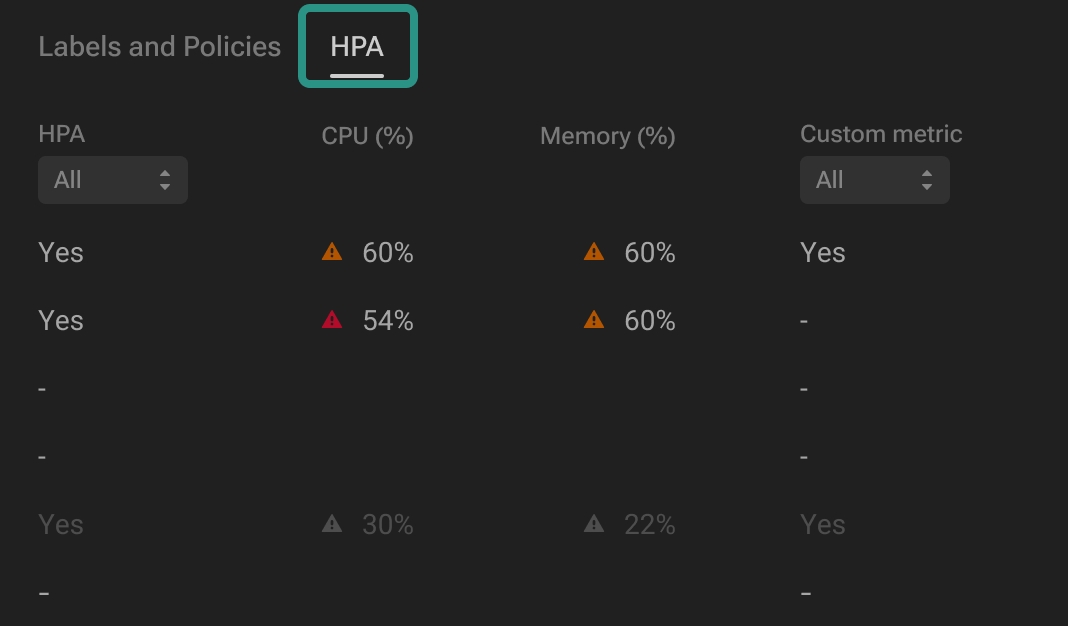 Indicates whether HPA has been introduced for the workload. You can easily sort the column by clicking the header or apply specific filters.