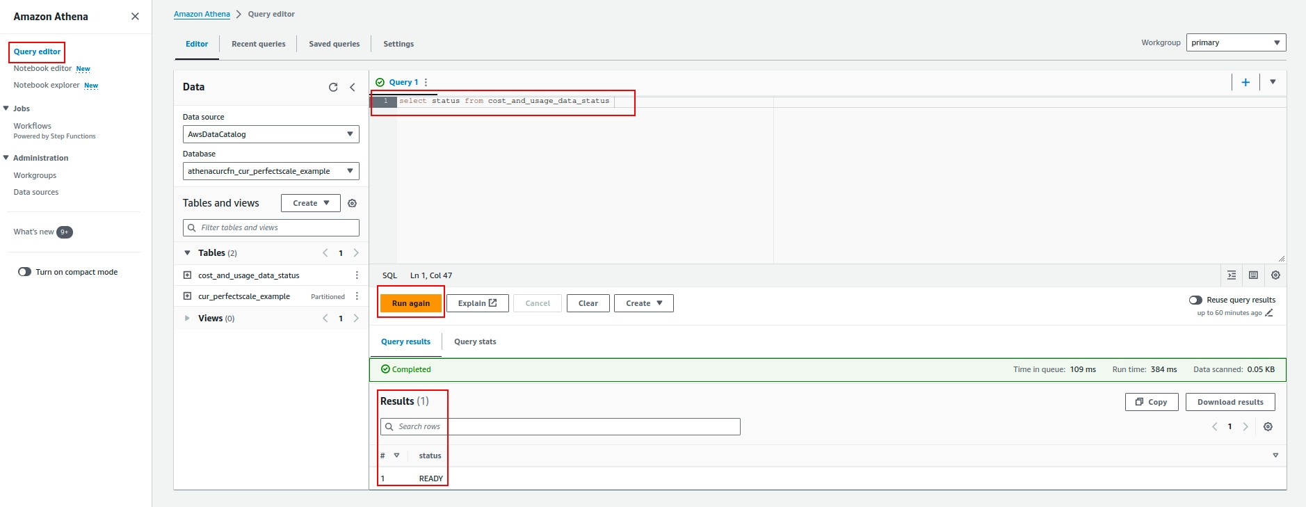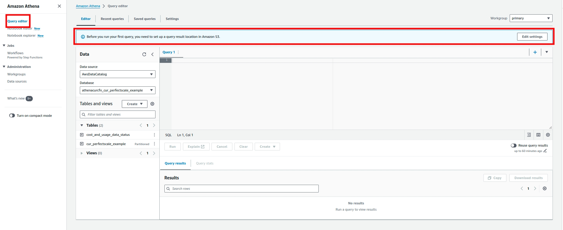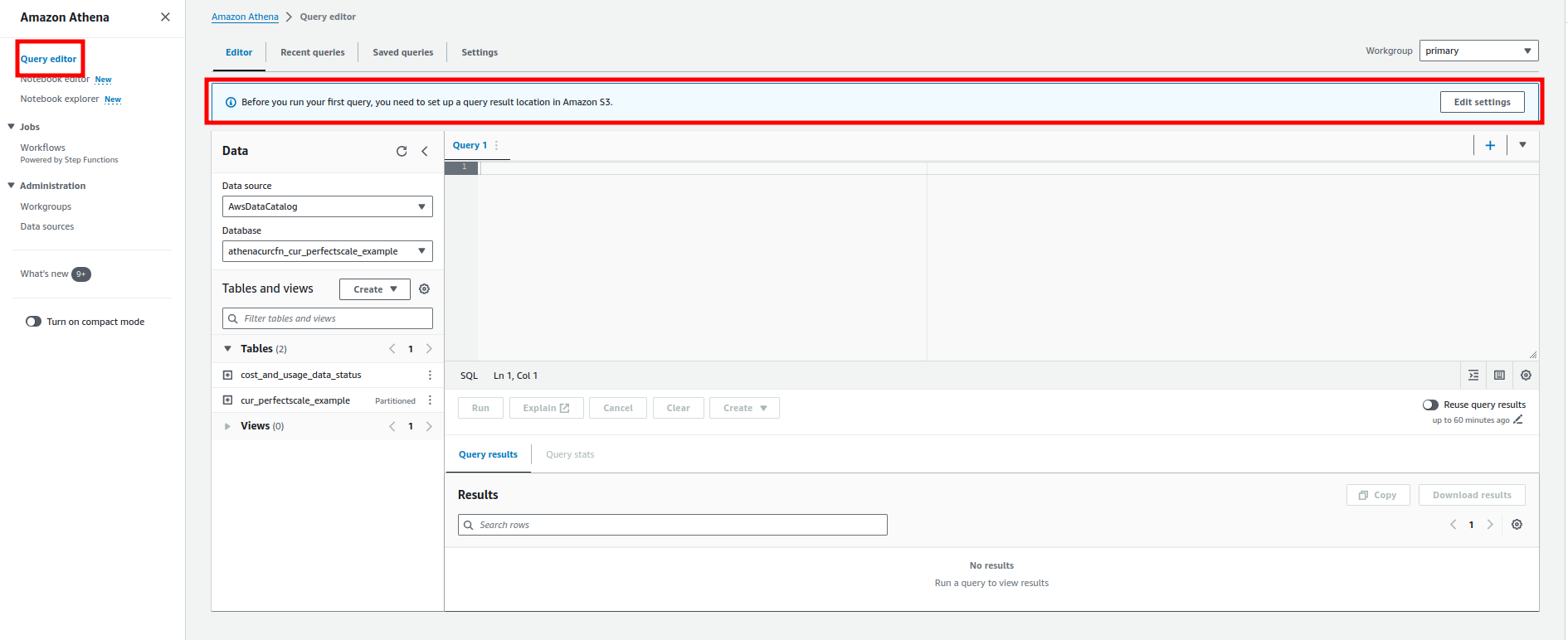 Amazon Athena settings2 Return to the Query editor and run the following query to ensure the configuration works properly: