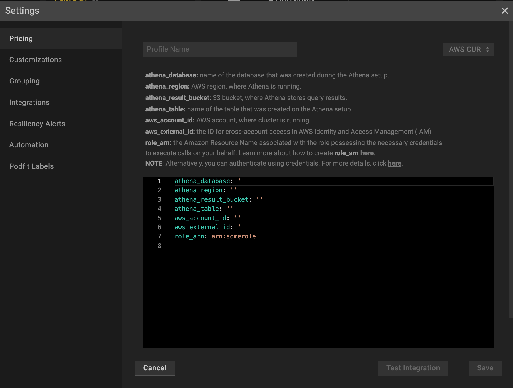 Configuring AWS pricing integration with AWS CUR profile