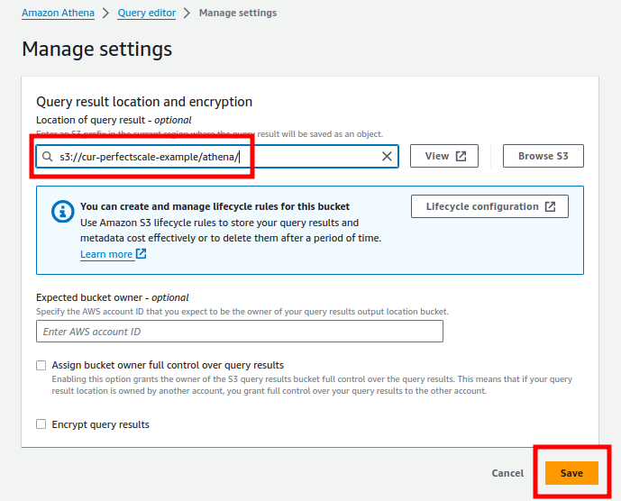 Query result location and encryptionwrite down the path to the created for the CUR bucket, or use another bucket (for example,s3://cur-perfectscale-example/athena/) and clickSave.