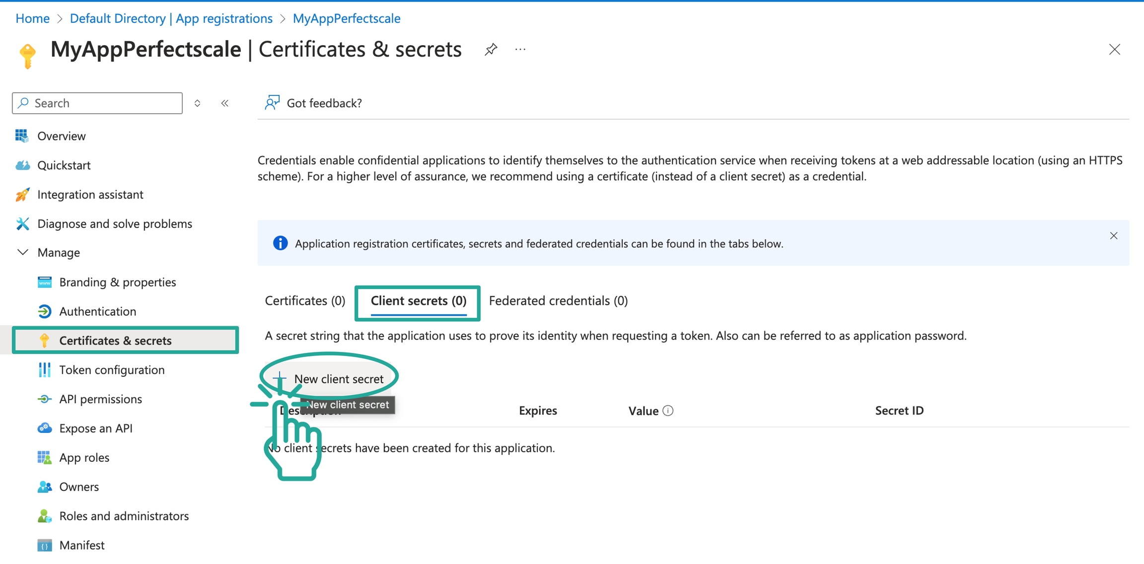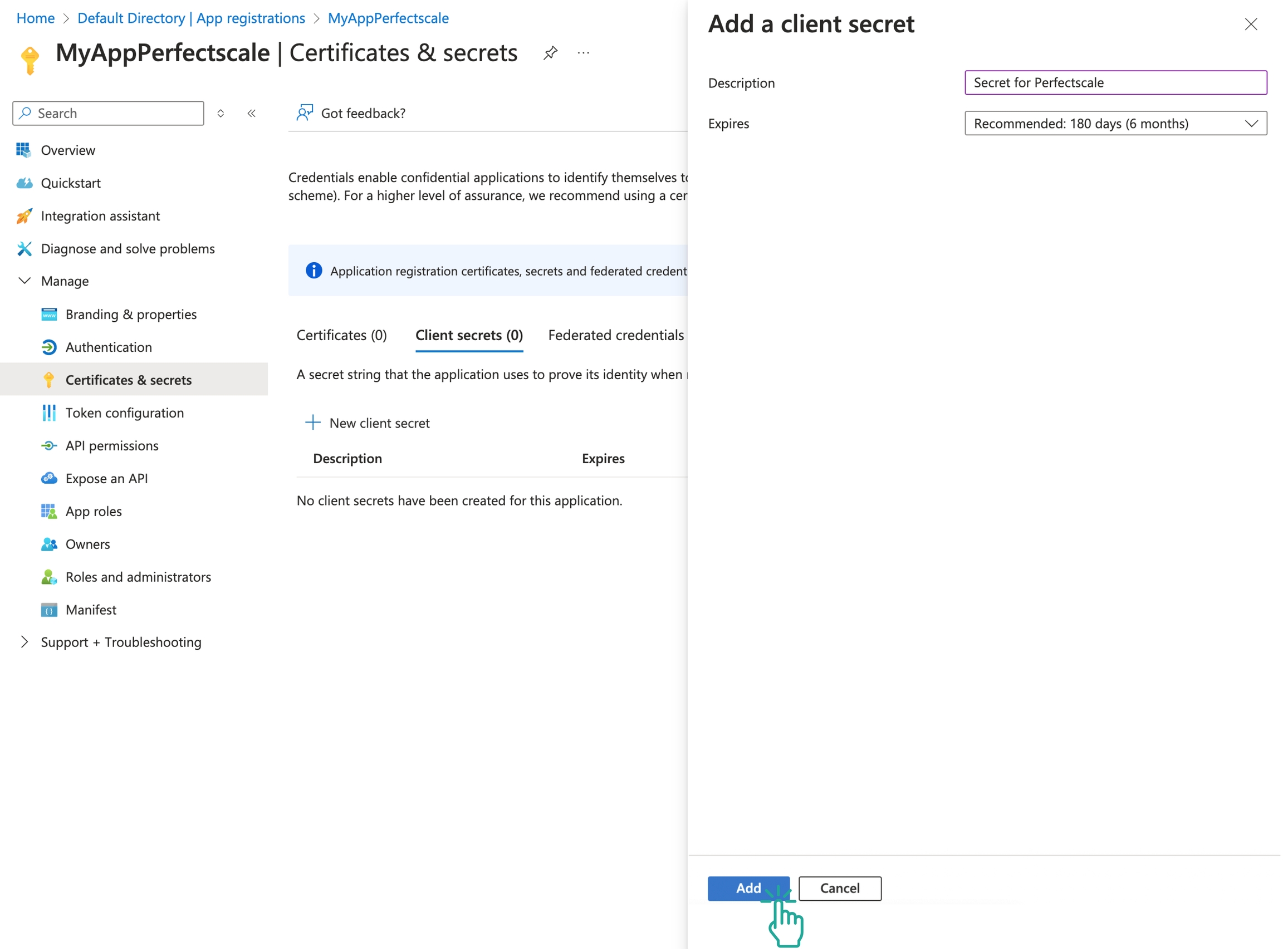 New client secret Add a description, for example, Secret for PerfectScale, and set an expiry period as needed.