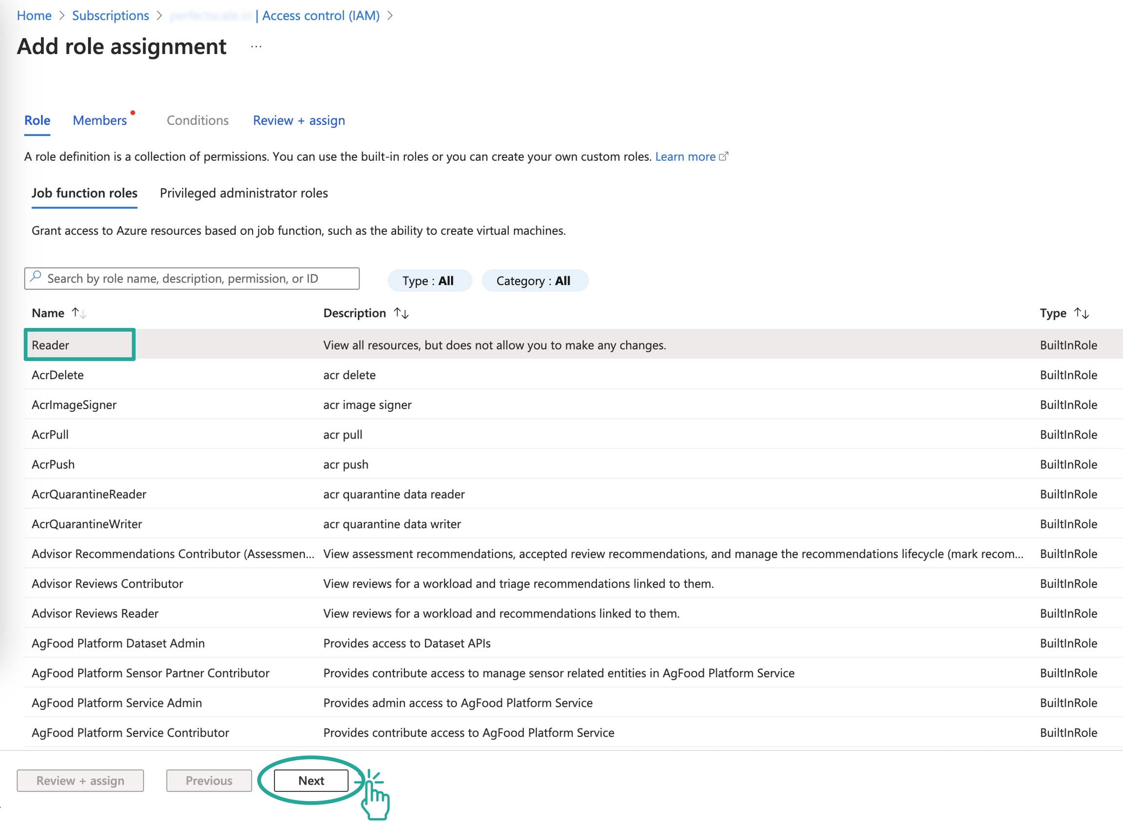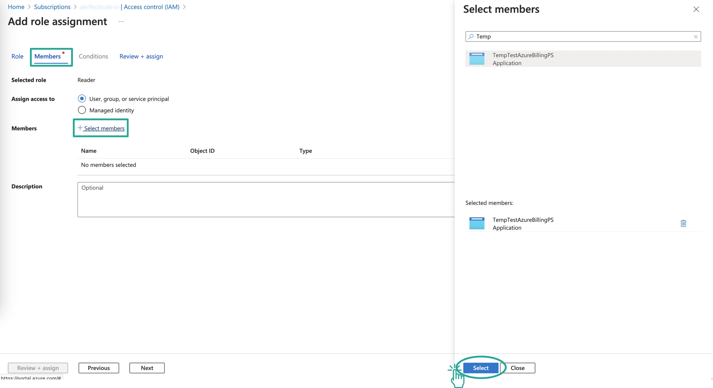 Reader role In the Members section, click Select Members and use the right-hand search menu to find your application (e.g., “MyApp”).