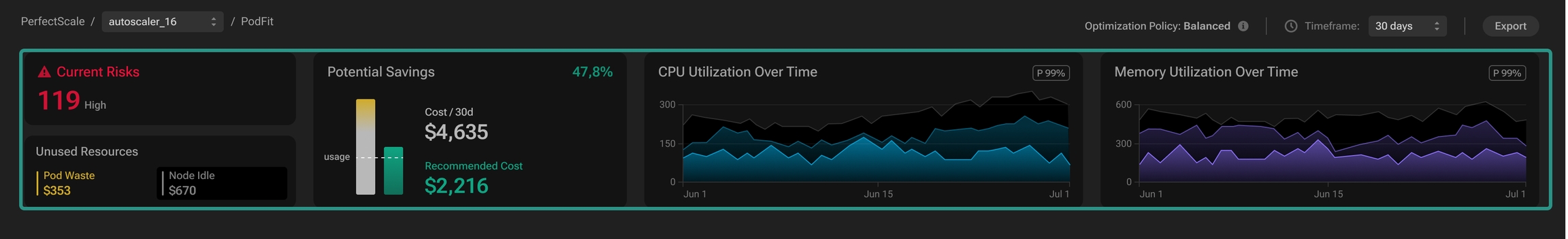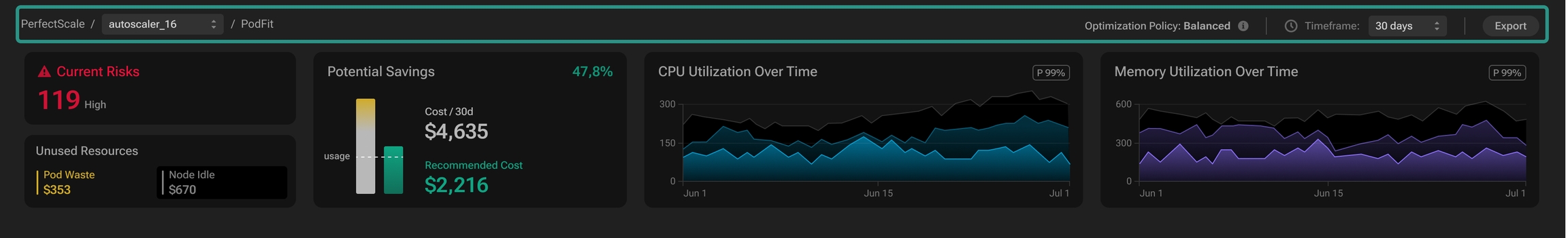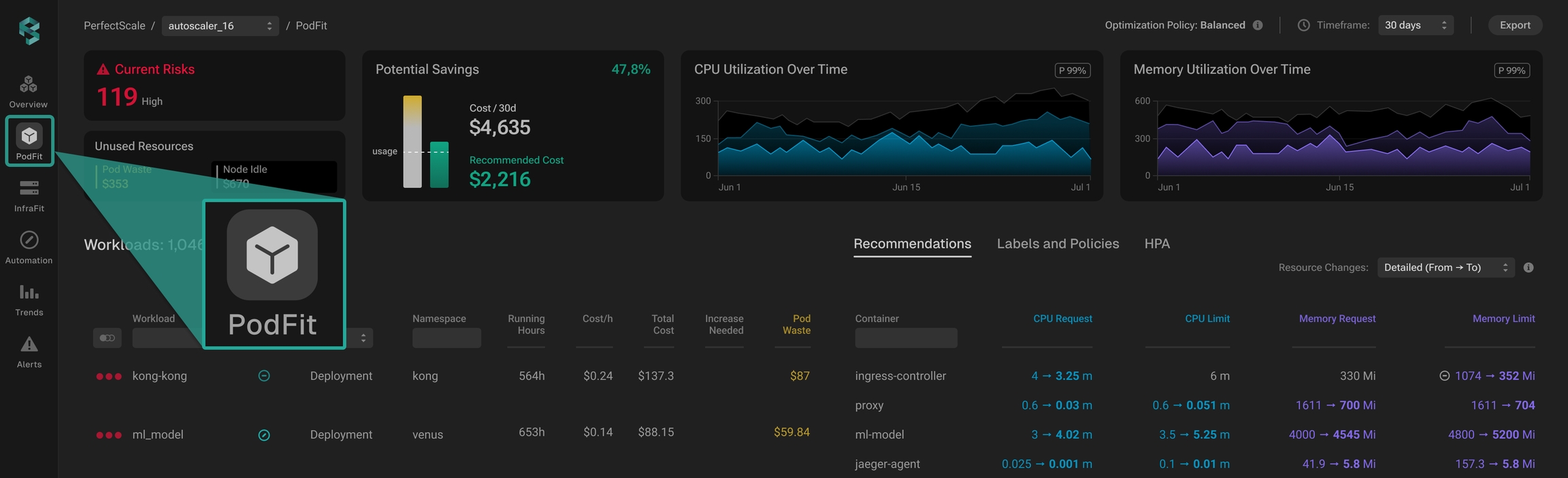 PerfectScale Podfit provides comprehensive insights into the health and costs of your cluster and its components, helping you quickly pinpoint areas requiring attention along with data-driven, actionable recommendations to streamline and enhance your optimization process.