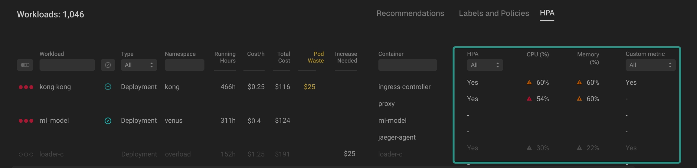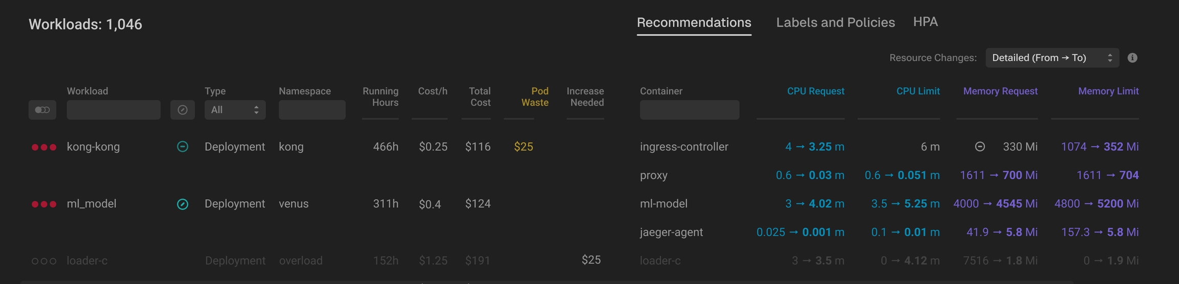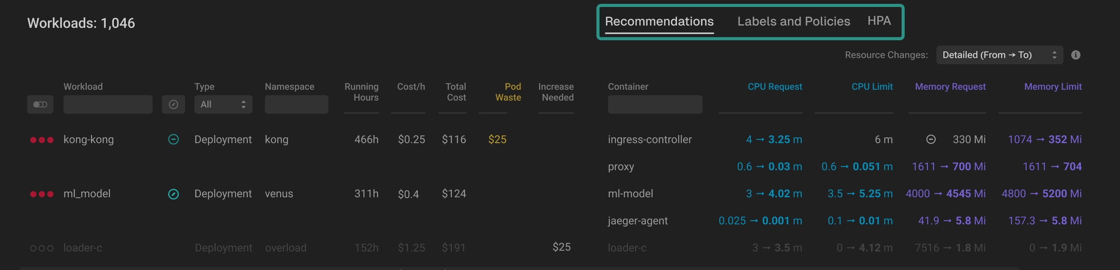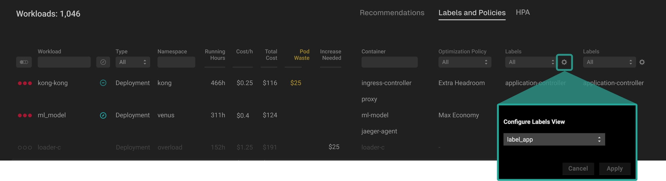 Easily jump between Recommendations, Labels and Policies, and HPA views using the switcher above the table.