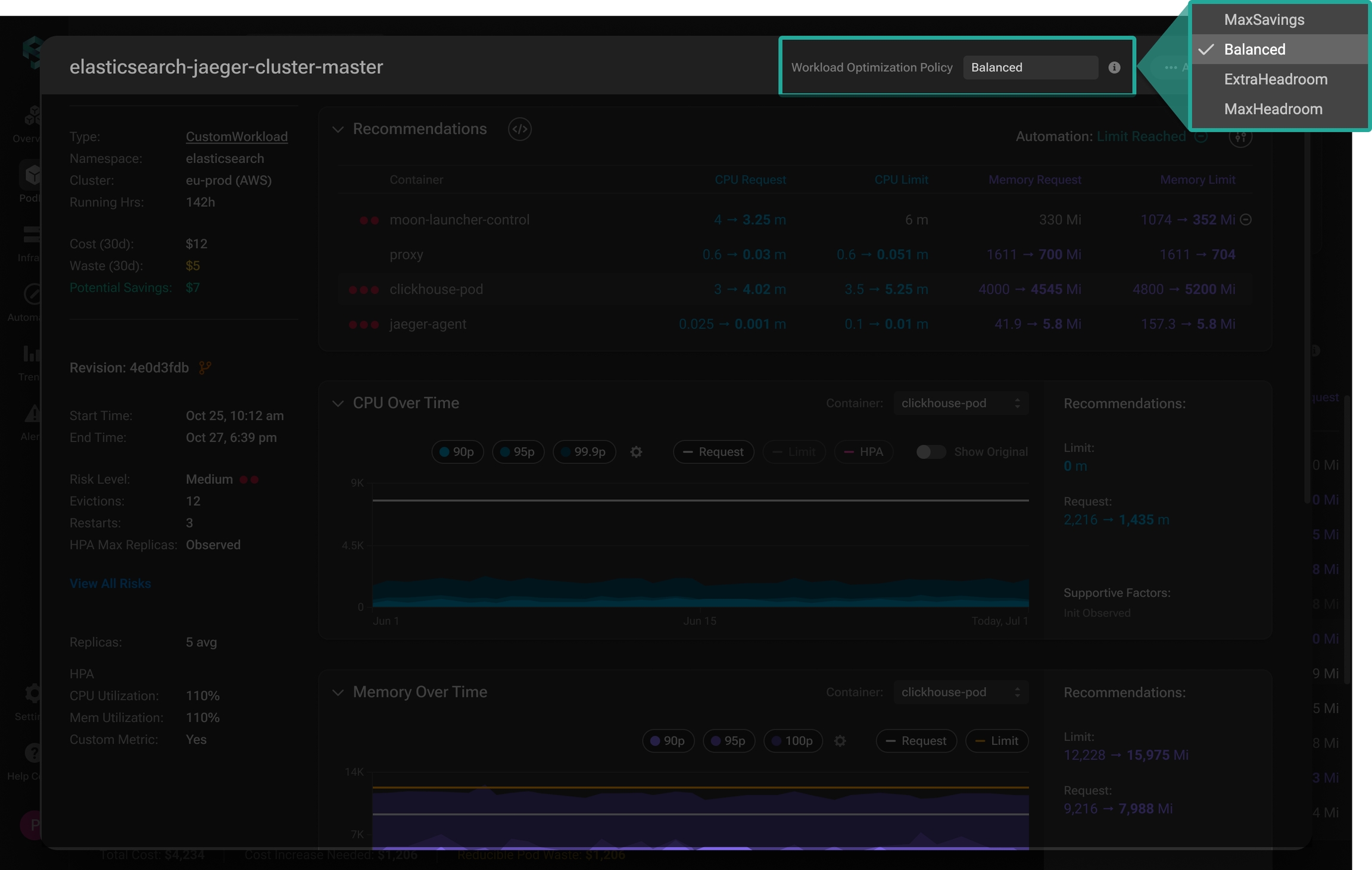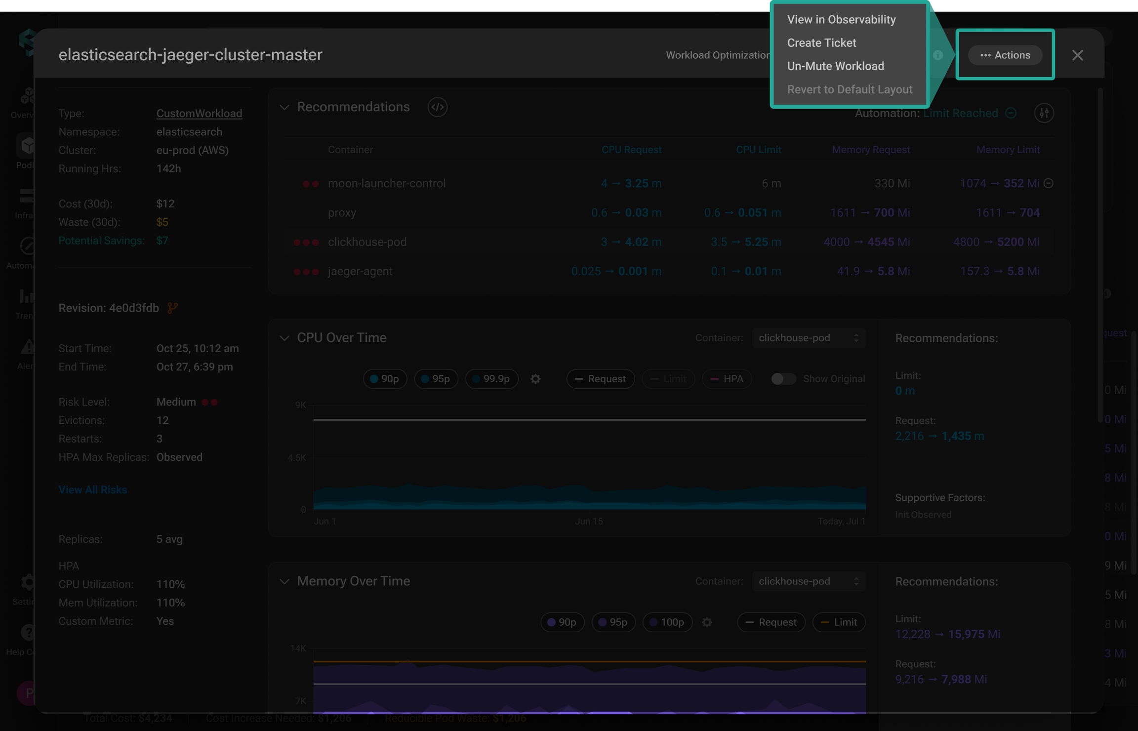 The zoom-in window provides comprehensive details of the workload's current state and behavior, along with historical data over time, delivering detailed metrics and unmatched visibility on resource utilization efficiency and performance risks. It provides actionable recommendations for adjusting resource allocations to enhance performance and minimize waste, and emphasizes the impact once they are implemented. Additionally, users can explore the Revision History, which displays all updates and changes, including automated or manual adjustments made to the workload, simplifying further analysis and helping track optimization progress over time.
