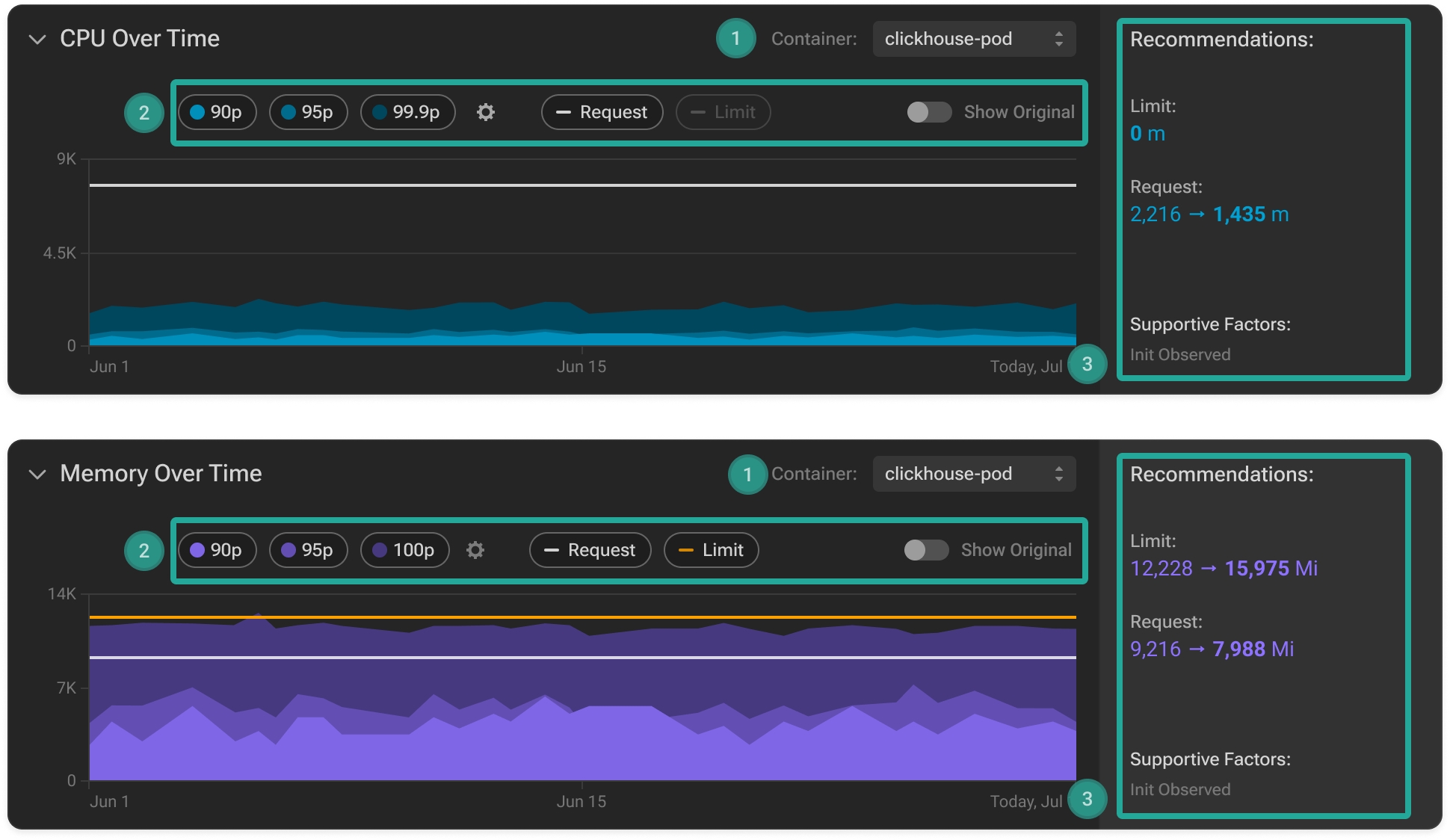 These widgets provide a granular historical view of CPU and Memory utilization per container over the past 30 days, including the p90, p95, and p99.9 utilization percentiles, enabling you to seamlessly evaluate the efficiency of resource distribution by leveraging a comprehensive visual comparison of these values with set resource requests and limits.