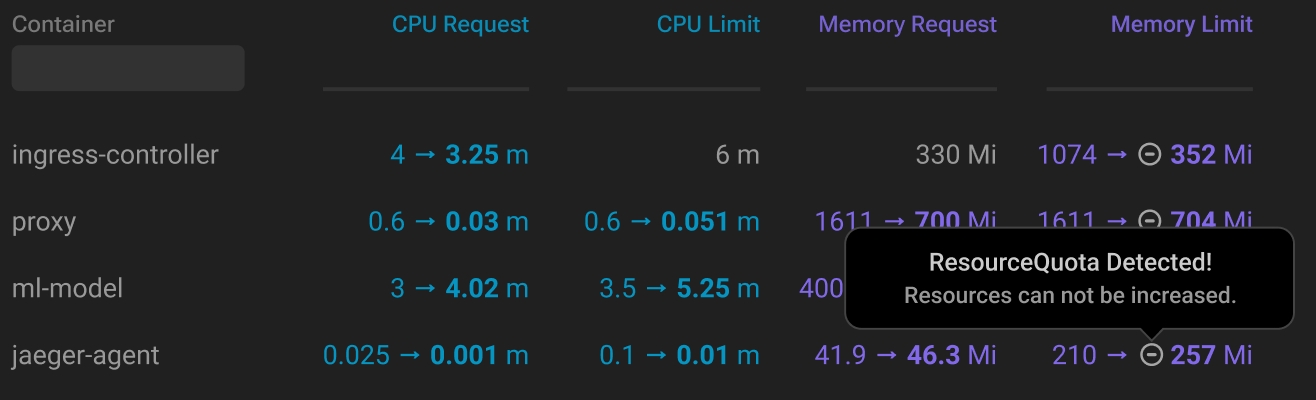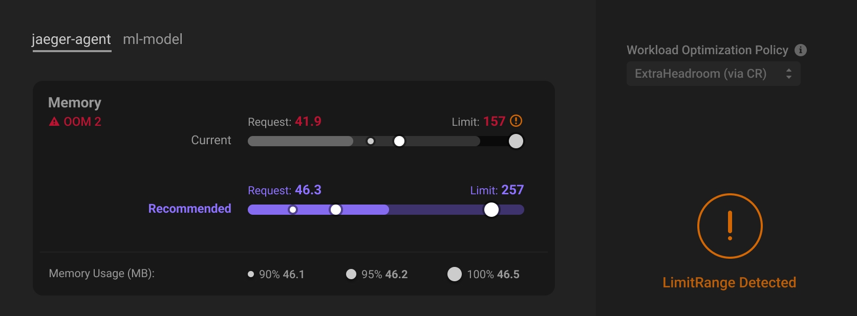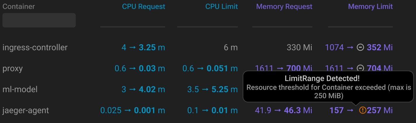 When PerfectScale detects that its recommended resource allocation either exceeds or falls below the specified LimitRange for your pods and containers, the relevant indicator will be raised.