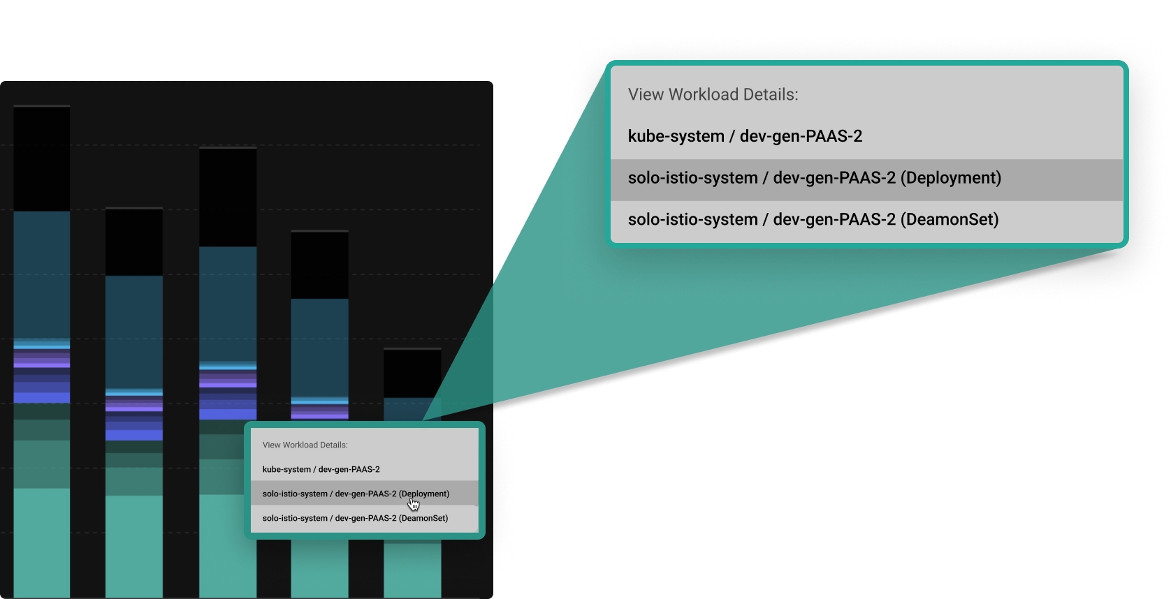 Stack the data by workload to get the overtime cost, waste, or risk trend insights for each workload in your environment. Right-clicking on a workload in the chart will open a Workload Details tooltip, displaying a list of the namespaces where this workload exists.