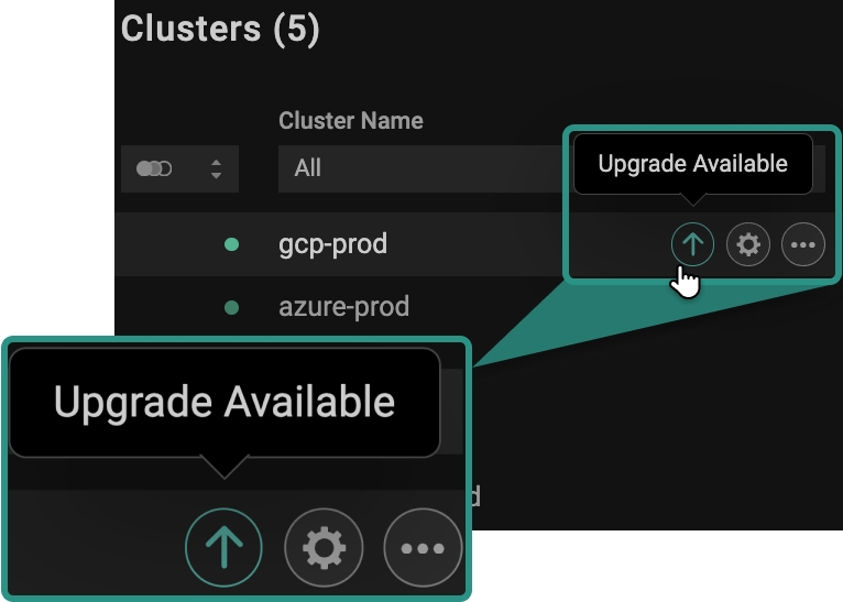 Displays the names of the onboarded clusters. Use the search bar to quickly find a specific cluster, or sort the clusters by clicking on the column header.