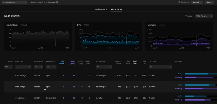 Identify wasted node resources and gain optimization insights to select the right nodes to better serve your environment's needs with the Node Types view.