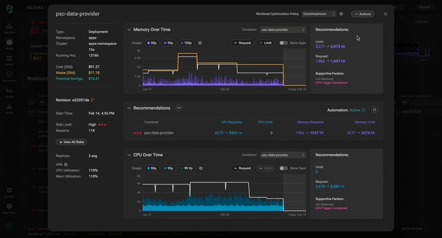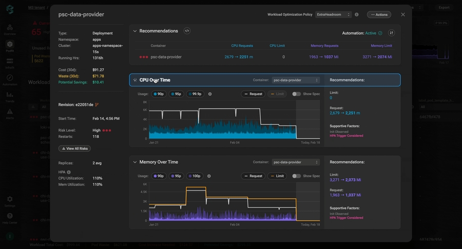 The workload details panel offers unparalleled visibility into workload resource utilization at any moment over the past 30 days, identifying inefficiencies in real-time and uncovering new optimization opportunities. Providing data-driven optimization recommendations empowers you to take action proactively, enhance efficiency, and reduce costs while maintaining high performance.