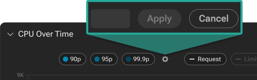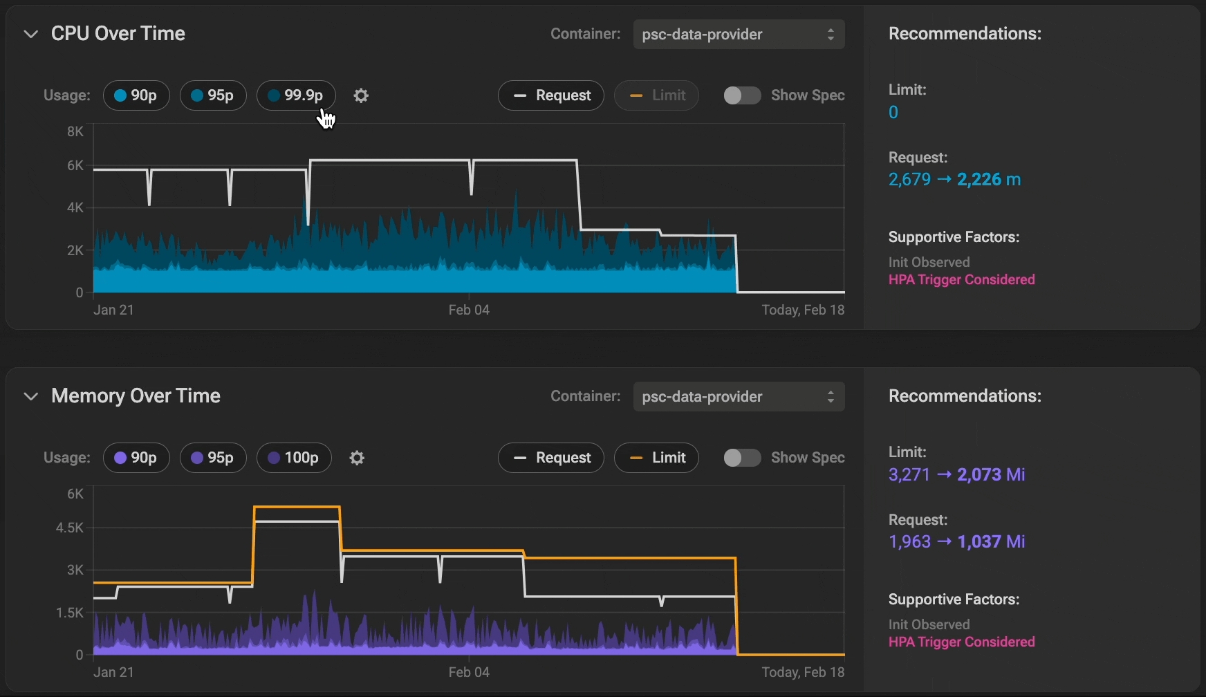 These widgets provide a granular historical view of CPU and Memory utilization per container over the past 30 days, including the p90, p95, and p99.9 utilization percentiles, enabling you to seamlessly evaluate the efficiency of resource distribution by leveraging a comprehensive visual comparison of these values with set resource requests and limits.