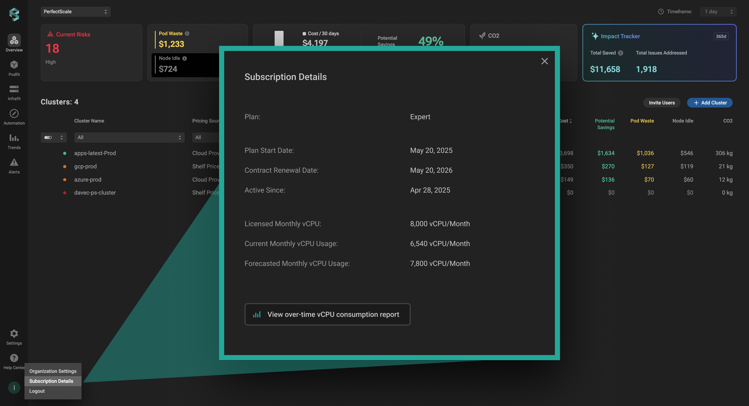 PerfectScale by DoiT has built a valuable feature that provides both the team and customers seamless access to subscription details, including visibility into normalized monthly vCPU consumption right within the platform.